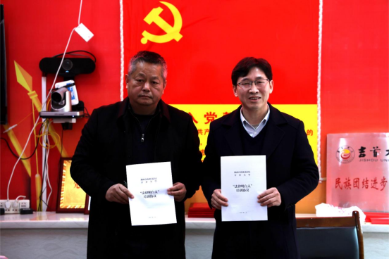 随后,聂春辉与郑牧民代表双方签订法律明白人培训协议;聂春辉与我校驻五官村乡村振兴工作队队长桂克印共同为“法润三湘·湘西自治州老员工普法志愿者yL23411永利官网登录工作点”揭牌。法管学院副书记段武城为志愿者授“送法下乡志愿服务团”团旗,并为志愿者代表颁发志愿者证。郑牧民与五官村村支书田金旺签订法律志愿服务协议,润雅乡党委书记林国志为法管学院杨佶副教授颁发五官村法律顾问证书。志愿者代表倪伟及五官村法律顾问杨佶分别发言,表达了积极参与和助力法治乡村建设的决心。